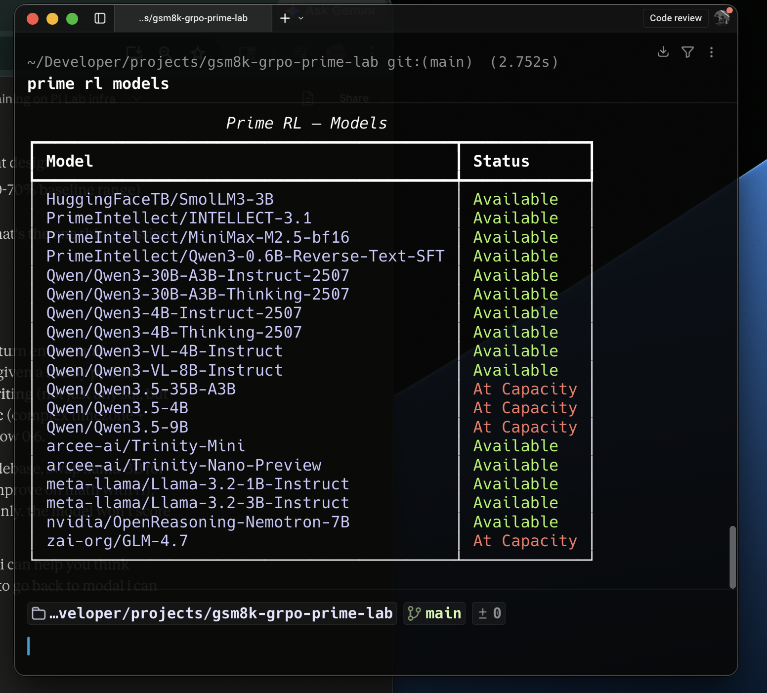 The environment itself was primeintellect/gsm8k, a pre built single turn environment from the hub. It handles the dataset loading, the prompt formatting, and the exact match reward function. Under the hood this whole approach sits on the verifiers library, which is basically the layer that makes these RL environments composable in the first place.