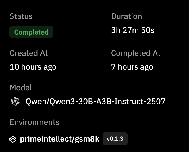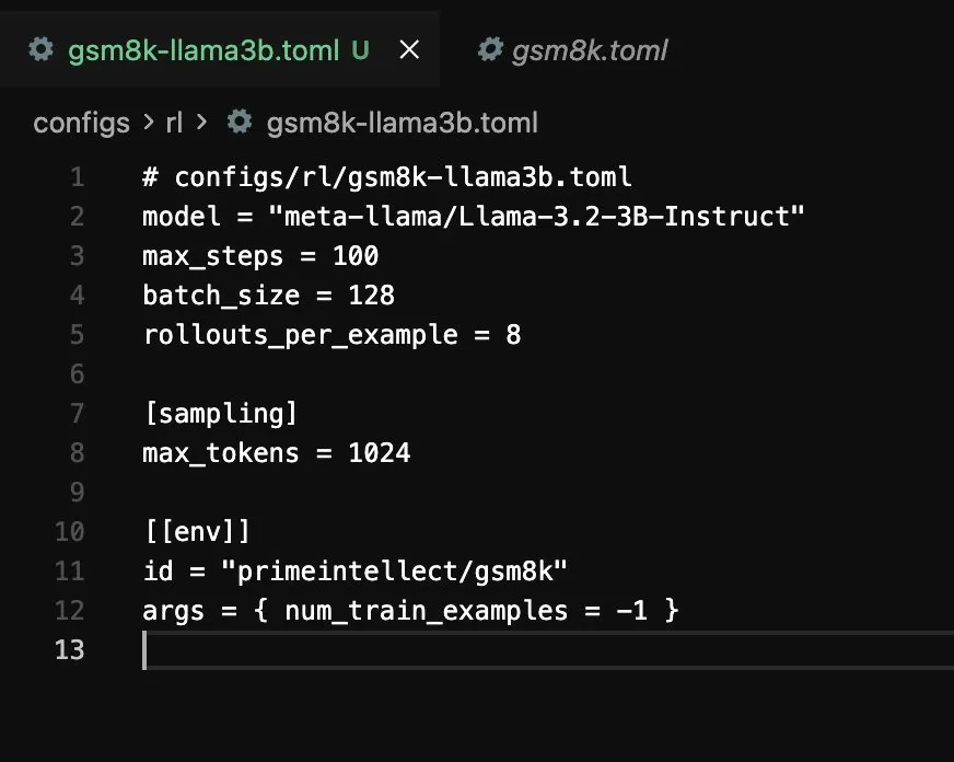 The first blog used Modal as infra and I wrote the training logic myself. That was very good for learning, but it also means every experiment has a lot of surface area for bugs. With Prime Intellect Lab the whole thing flips. You write a TOML config, point it at a model and an environment, and run one command.